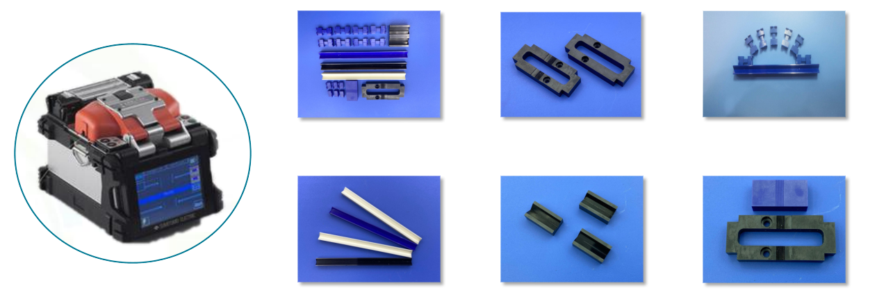 陶瓷V槽:采用藍(lán)色氧化鋯陶瓷,相對(duì)于白色氧化鋯,藍(lán)色辨識(shí)度更高,相對(duì)于黑色氧化 鋯,藍(lán)色不易吸熱,耐磨性好等優(yōu)點(diǎn)通過(guò)V形槽導(dǎo)正兩根光纖的中心和高度一致性,使光纖在 瞬間的高壓電弧產(chǎn)生的高溫下迅速融化并能精準(zhǔn)對(duì)接融合在一起;現(xiàn)可以加工單槽單V,單槽雙 V,多槽單V,多槽雙V;